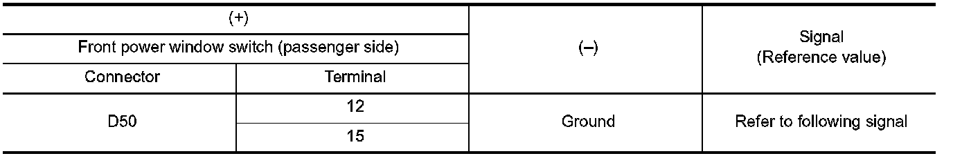 2. Check signal between front power window switch (passenger side) harness connector and ground with oscilloscope.