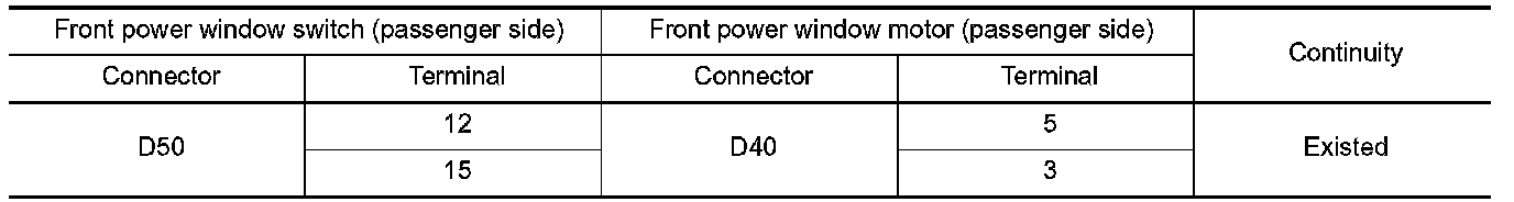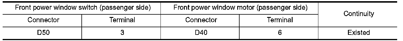2. Check continuity between front power window switch (passenger side) harness connector and front power window motor (passenger side) harness connector.