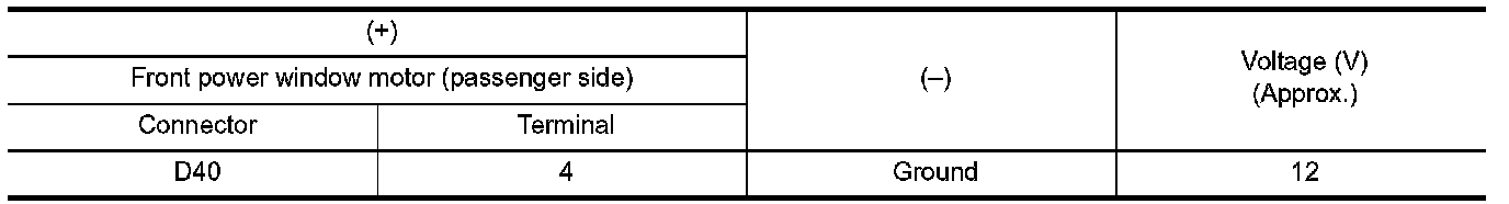 3. Check voltage between front power window motor (passenger side) harness connector and ground.