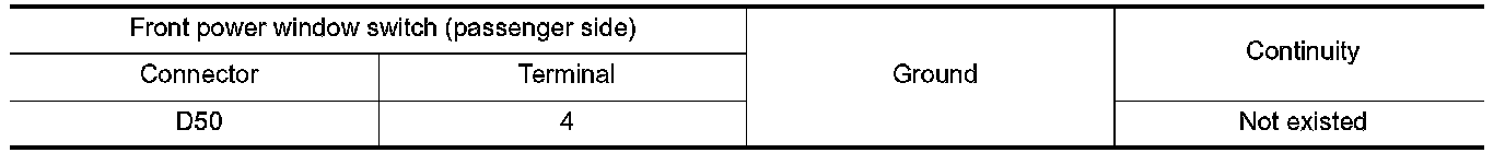 4. Check continuity between front power window switch (passenger side) harness connector and ground.