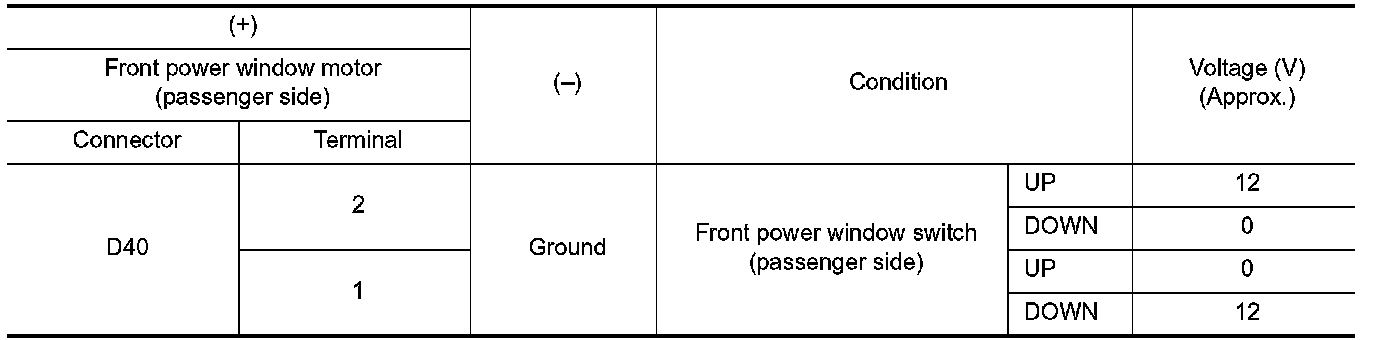 Check front power window motor (passenger side) operation with power window main switch or front power window switch (passenger side).