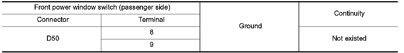 4. Check continuity between front power window switch (passenger side) connector and ground.