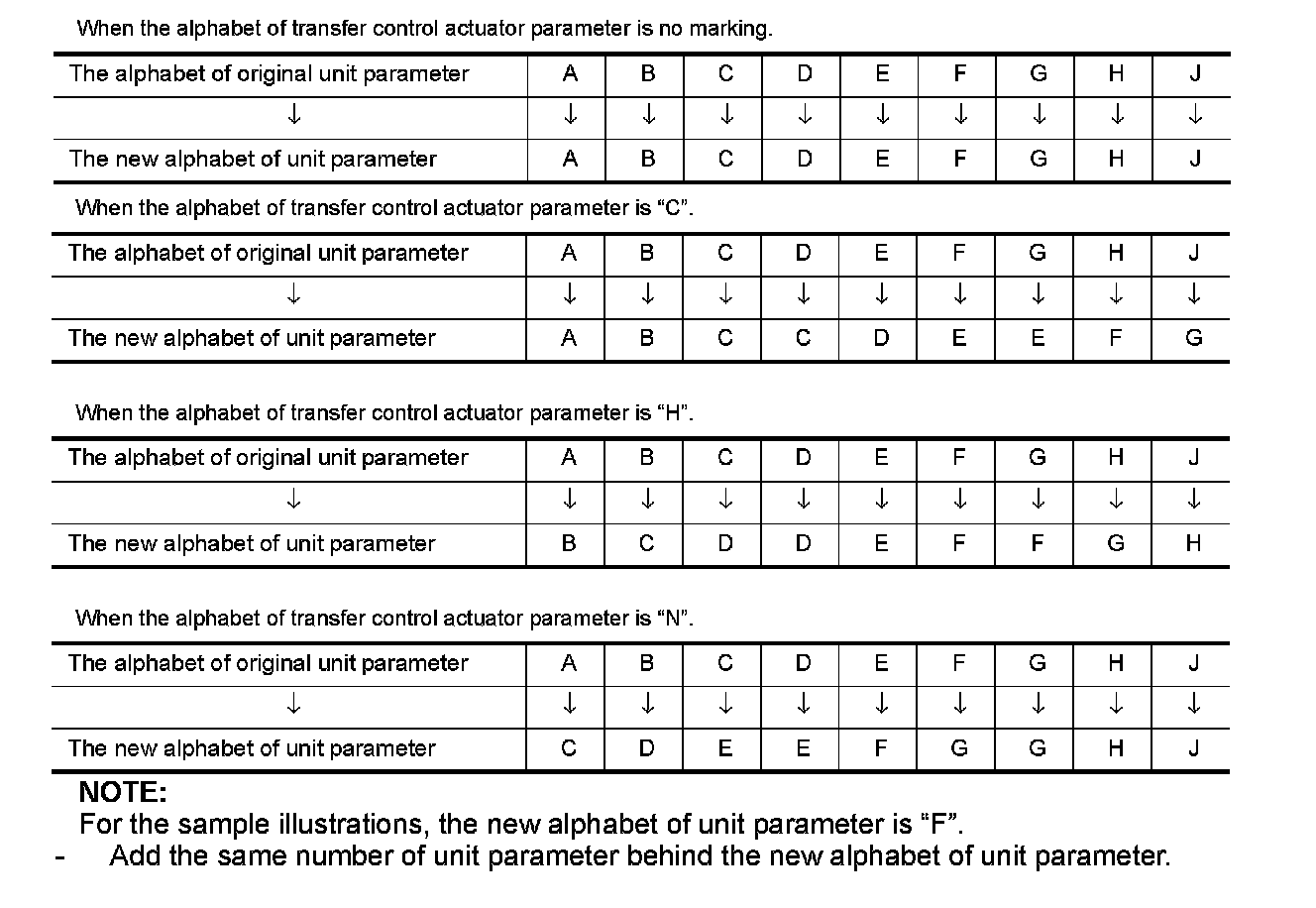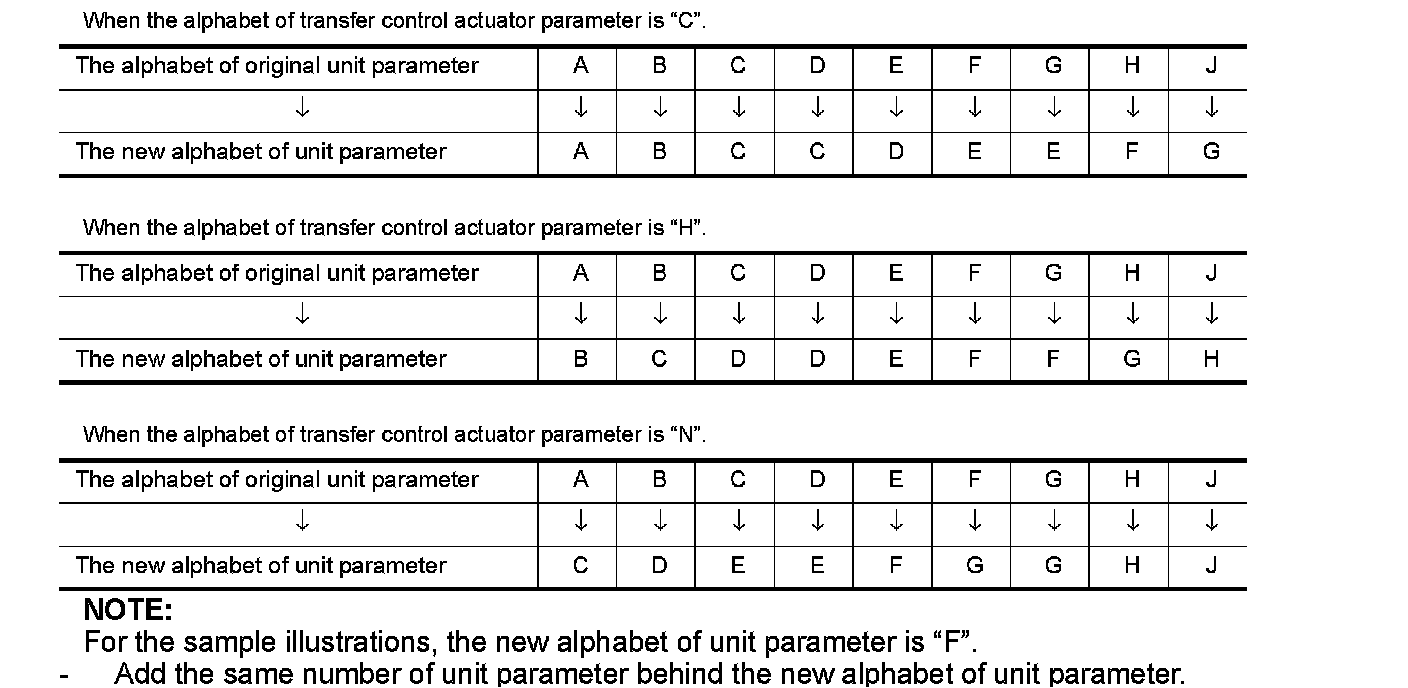 - Make new alphabet of unit parameter as to the alphabets of unit parameter and the transfer control actuator parameter, using following chart.