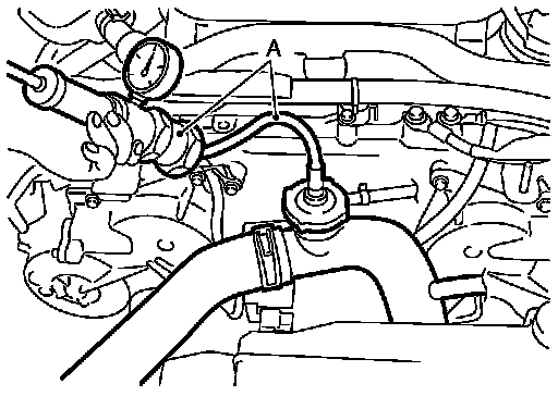 - To check for leakage, apply pressure to the cooling system with the radiator cap tester and radiator cap tester adapter (commercial service tool) (A).