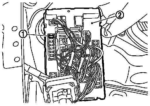 3.Disconnect fuel pump fuse (1) from IPDM E/R (2) to avoid fuel injection during measurement.