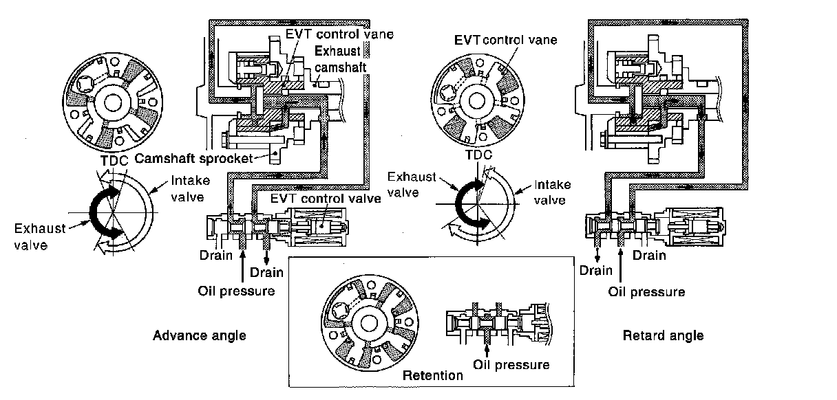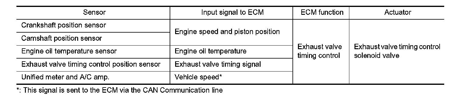 The ECM receives signals such as crankshaft position, camshaft position, engine speed, and engine oil temperature. Then, the ECM sends ON/OFF pulse duty signals to the exhaust valve timing control solenoid valve depending on driving status. This makes it possible to control the shut/open timing of the exhaust valve to increase engine torque and output in a range of high engine speed.