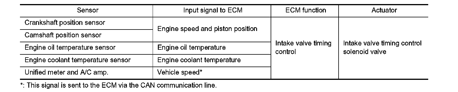 The ECM receives signals such as crankshaft position, camshaft position, engine speed, and engine coolant temperature. Then, the ECM sends ON/OFF pulse duty signals to the intake valve timing control solenoid valve depending on driving status. This makes it possible to control the shut/open timing of the intake valve to increase engine torque in low/mid speed range and output in high speed range.