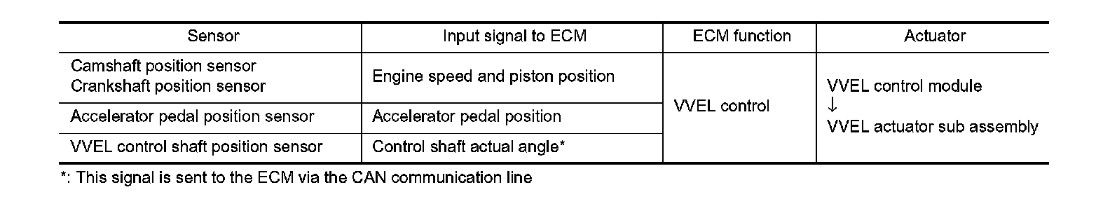 VVEL (Variable Valve Event & Lift) is a system that controls valve event and valve lift continuously. Rotational movement of the drive shaft equipped with eccentric cam is transmitted to output cam via the rocker arm and two kinds of links to depress the intake valve. ECM decides the target valve lift according to the driving condition and sends the command signal to the VVEL control module. The VVEL control module controls the rotation of the control shaft using the VVEL actuator motor and changes the movement of the output cam by shifting the link supporting point. As a result, valve lift changes continuously to improve engine output and response.