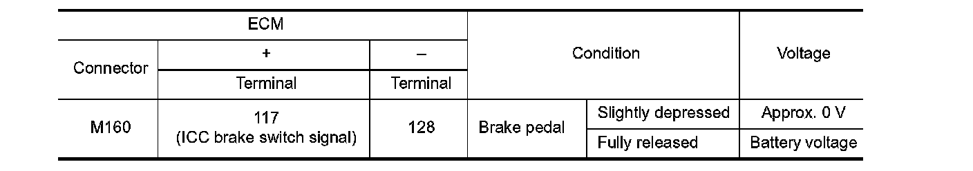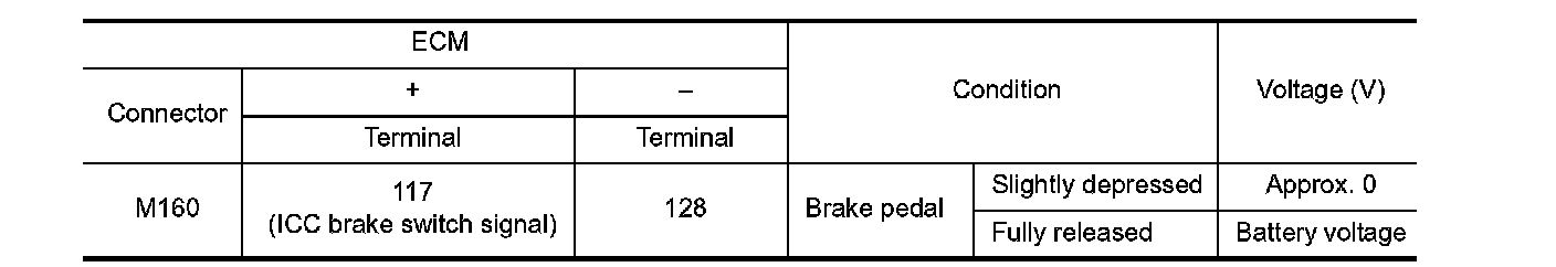 - Harness for open or short between ICC brake switch and ECM
