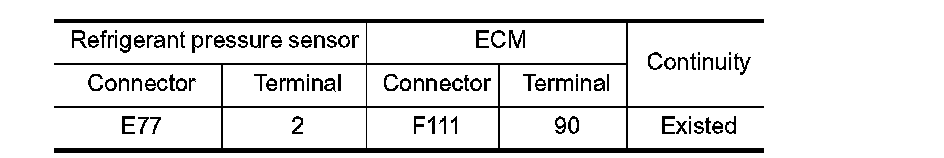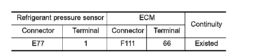 1.Check the continuity between refrigerant pressure sensor harness connector and ECM harness connector.