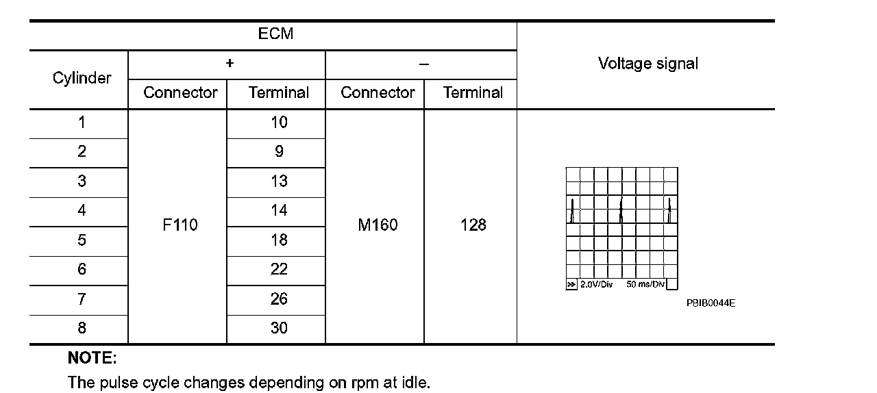 2.Read the voltage signal between ECM harness connector terminals under the following conditions with an oscilloscope.