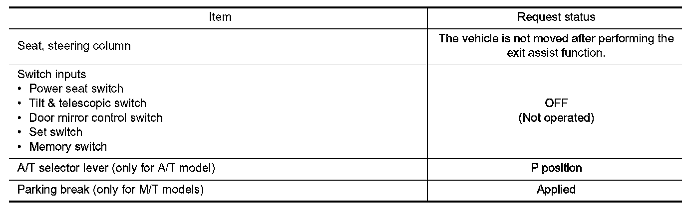 Satisfy all of the following items. The entry assist function is not performed if these items are not satisfied.