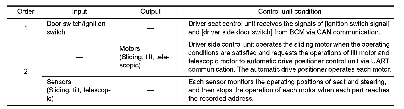 2.Driver seat and steering column will return from the exiting position to entry position.