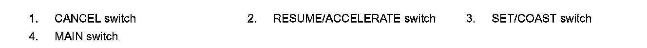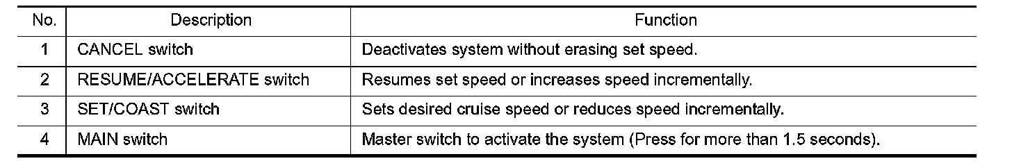 If the system is cancelled by conditions 1-5 below, the system will resume control at the last set cruising speed by pushing the RESUME/ACCELERATE switch.
