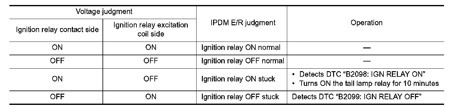 - IPDM E/R judges the ignition relay error if the voltage differs between the contact circuit and the excitation coil circuit.