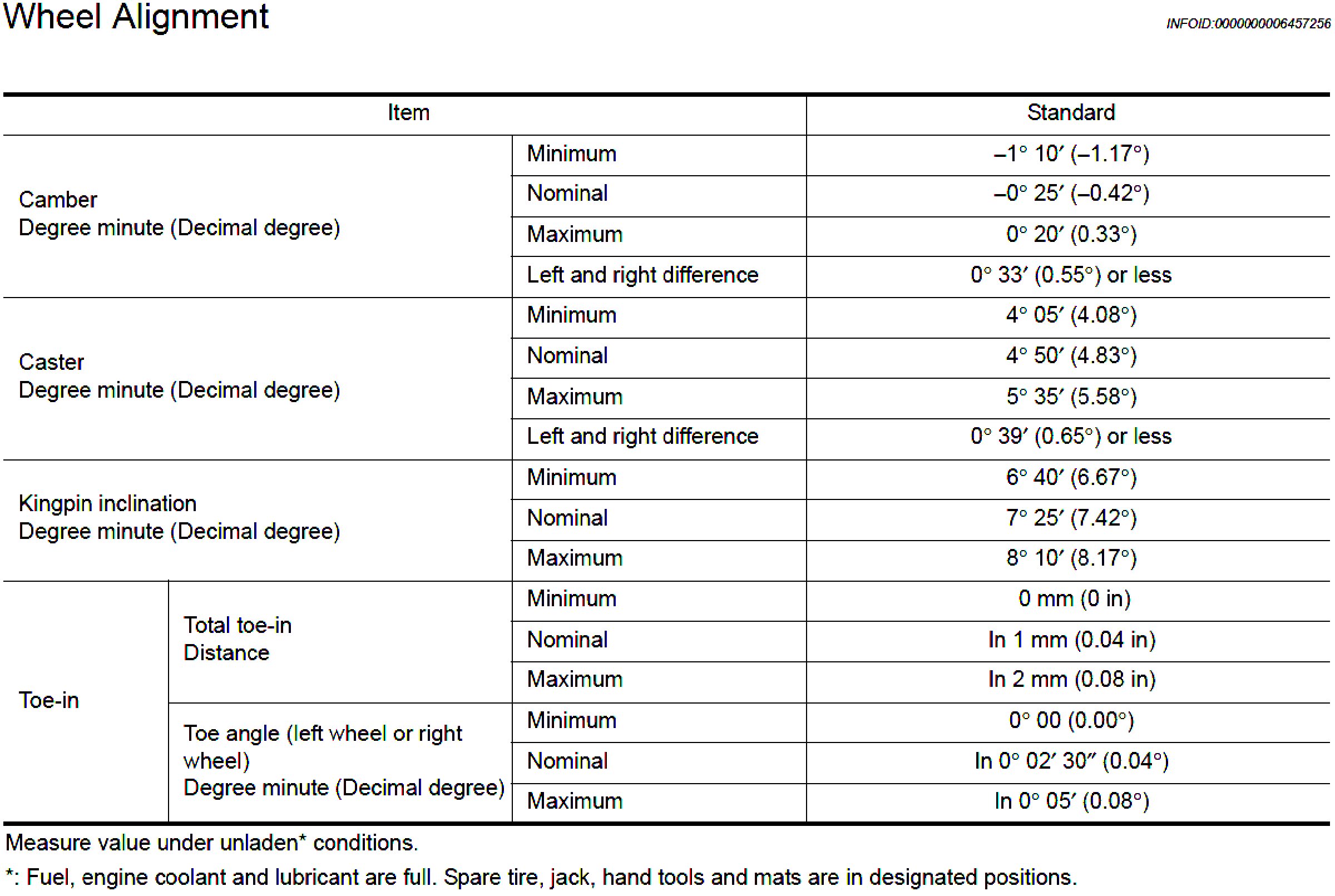 Wheel Alignment Specifications (Unladen)