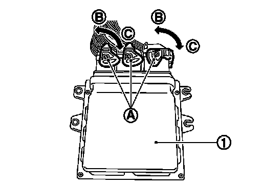 -Before connecting or disconnecting the ECM harness connector, turn ignition switch OFF and disconnect negative battery cable. Failure to do so may damage the ECM because battery voltage is applied to ECM even if ignition switch is turned OFF.