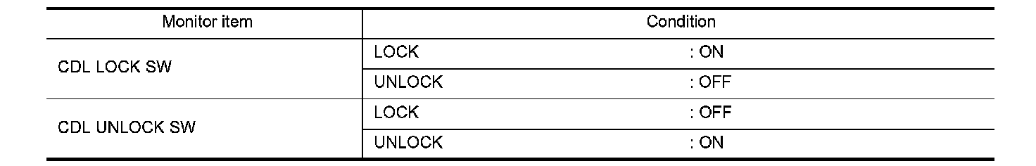 Check ("CDL LOCK SW ", "CDL UNLOCK SW") in "DATA MONITOR" mode for "POWER DOOR LOCK SYSTEM" with CONSULT. Consult Function.