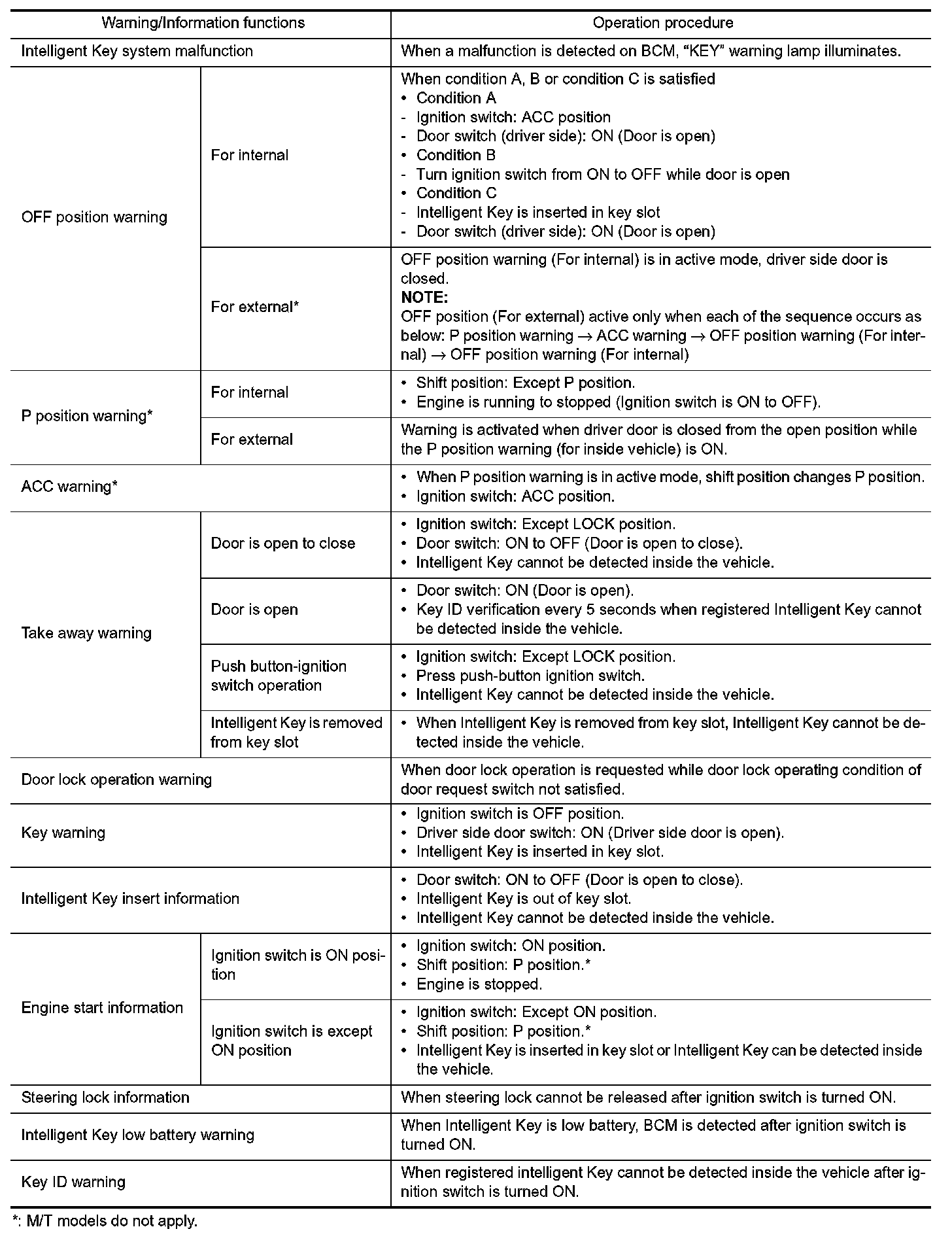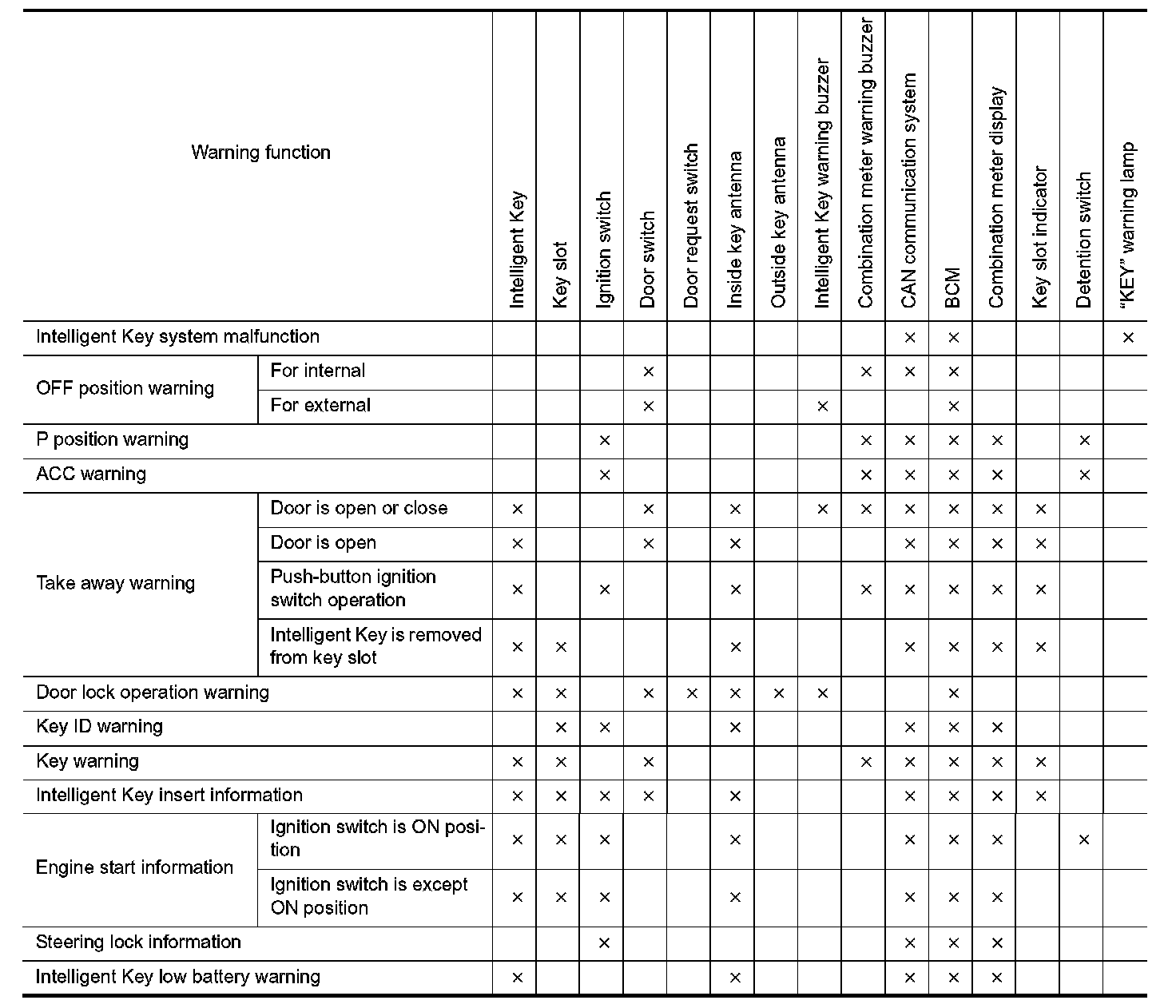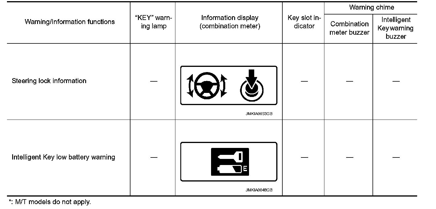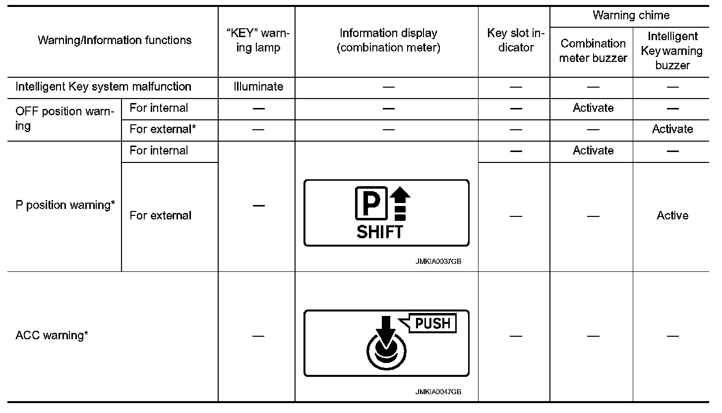 The warning function are as per the following items and are given to the user as warning information and warnings using combinations of Intelligent Key warning buzzer, KEY warning lamp, key slot indicator and information display in combination meter.
