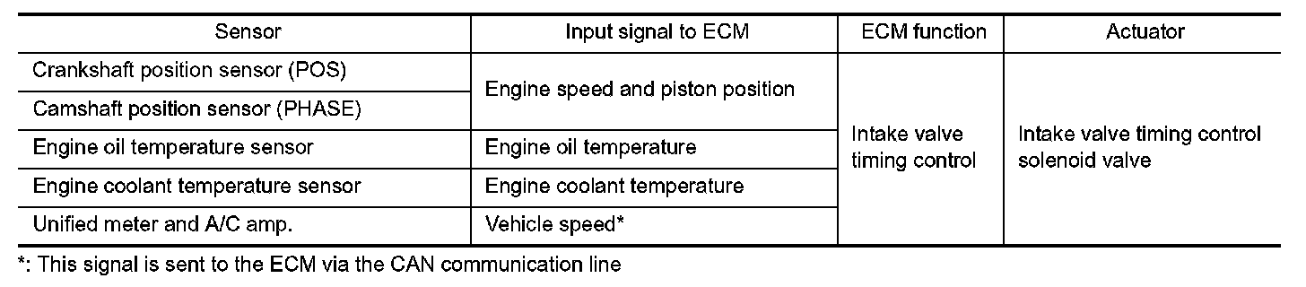 The ECM receives signals such as crankshaft position, camshaft position, engine speed, and engine coolant temperature. Then, the ECM sends ON/OFF pulse duty signals to the intake valve timing (IVT) control solenoid valve depending on driving status. This makes it possible to control the shut/open timing of the intake valve to increase engine torque in low/mid speed range and output in high-speed range.