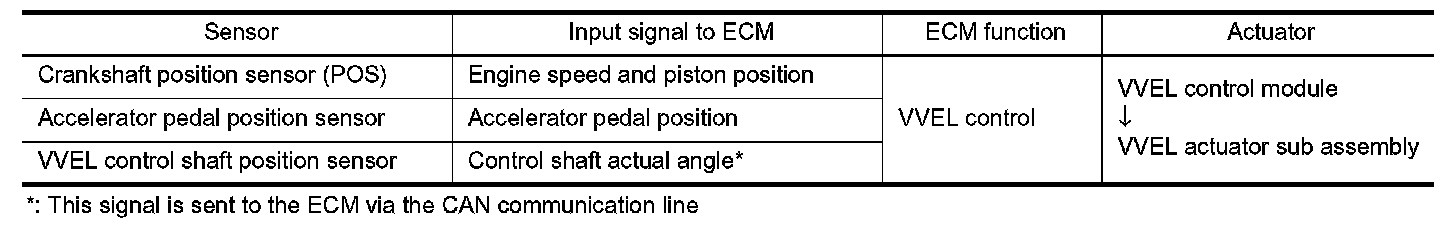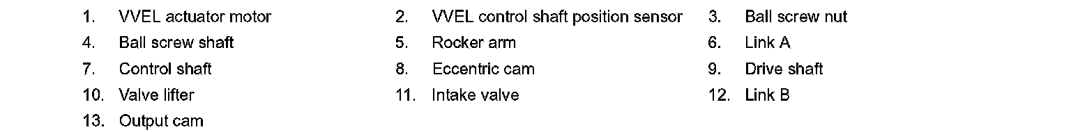 VVEL (Variable Valve Event & Lift) is a system that controls valve event and valve lift continuously. Rotational movement of the drive shaft equipped with eccentric cam is transmitted to output cam via the rocker arm and two kinds of links to depress the intake valve. ECM decides the target valve lift according to the driving condition and sends the command signal to the VVEL control module. The VVEL control module controls the rotation of the control shaft using the VVEL actuator motor and changes the movement of the output cam by shifting the link supporting point. As a result, valve lift changes continuously to improve engine output and response.