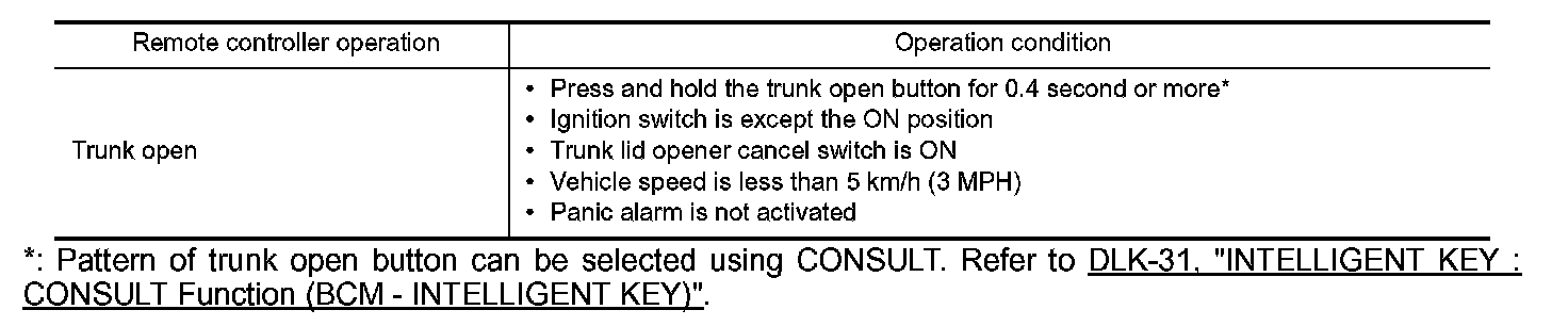 *: Pattern of trunk open button can be selected using CONSULT. Intelligent Key.