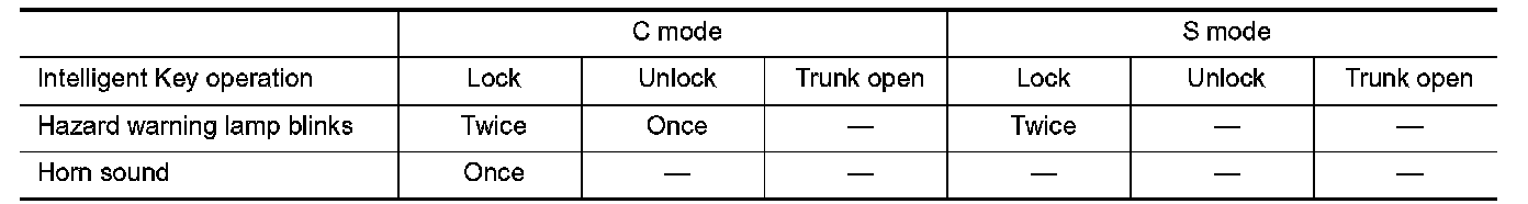 When LOCK and UNLOCK signals are sent from the Intelligent Key for more than 2 seconds at the same time, the hazard and horn reminder mode is changed and hazard warning lamp blinks and horn sounds as per the following items: