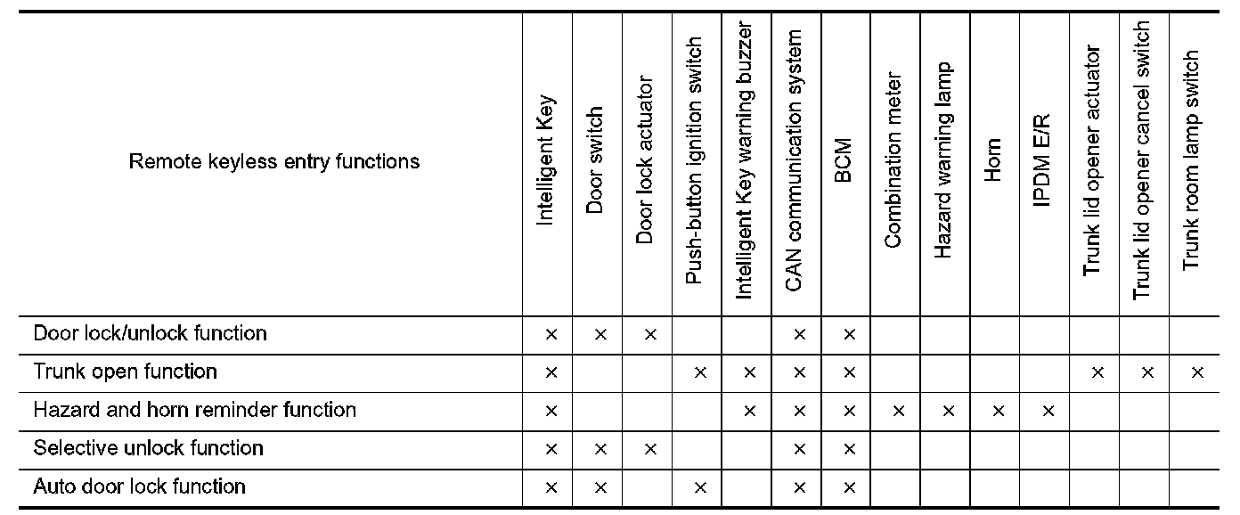 - When BCM receives the door lock/unlock signal, it operates all door lock actuators and fuel lid lock actuator the hazard lamp (lock: 2 times, unlock: 1 time) and horn chirp signal to IPDM E/R at the same time as a reminder.