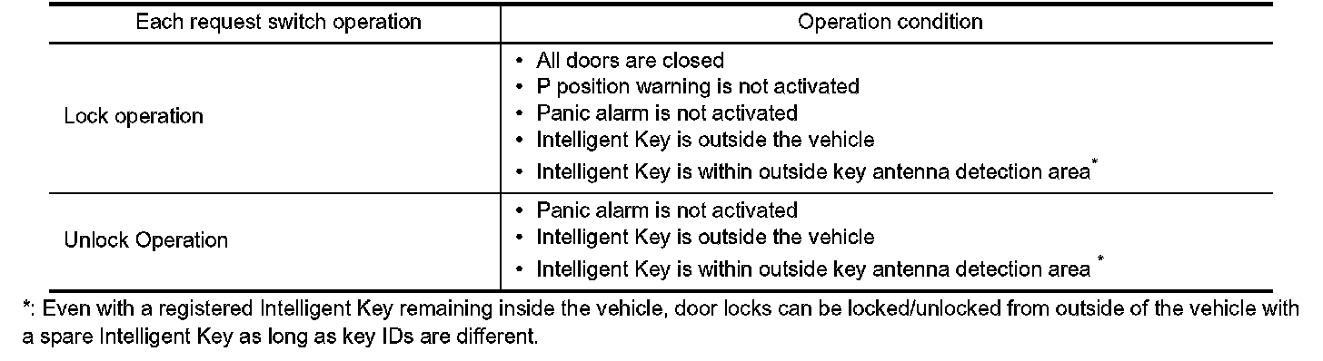 If the following conditions are satisfied, door lock/unlock operation is performed if the request switch is operated.