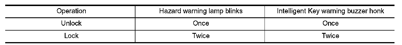 During lock, unlock, operation by each request switch, the hazard warning lamps and Intelligent Key warning buzzer will blink or honk as a reminder.