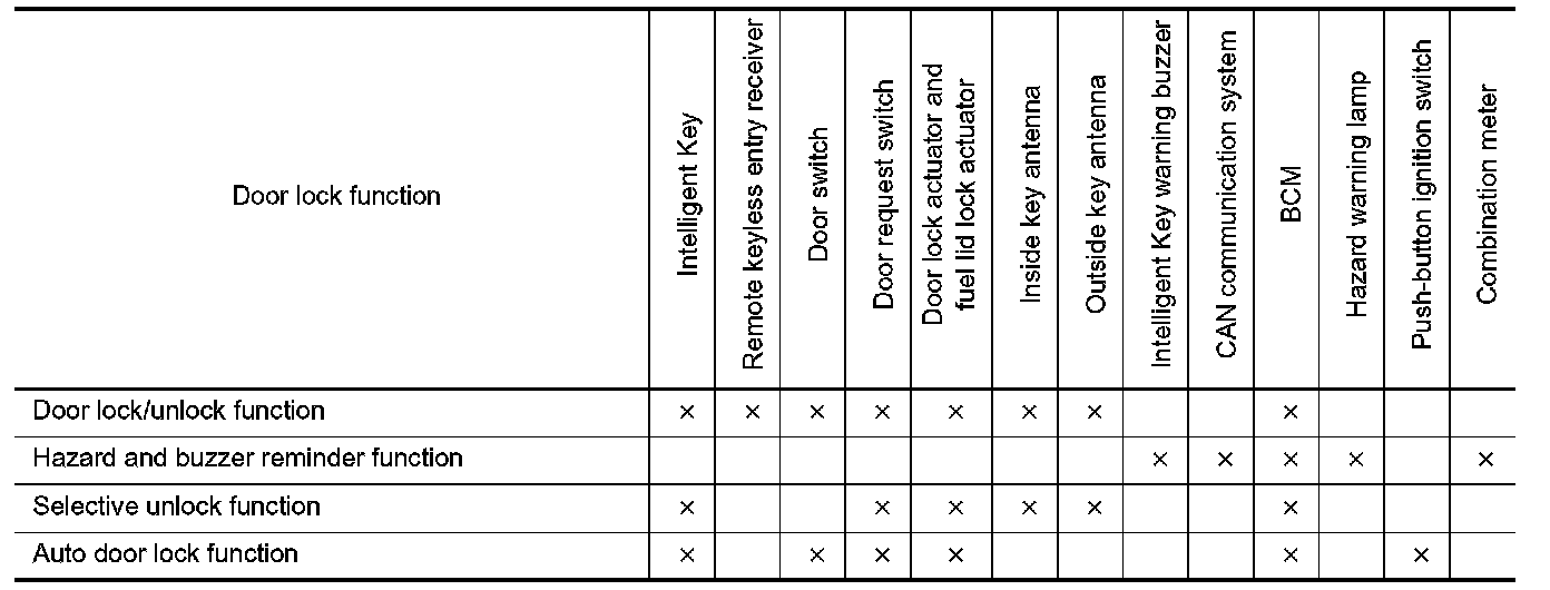 - BCM lock/unlock each door and fuel filler lid and sounds Intelligent Key buzzer warning (lock: 2 time, unlock: