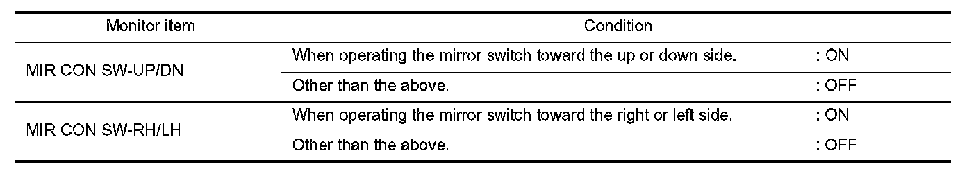 Check the operation on "MIRCONSW-UP/DN" and "MIRCONSW-RH/LH" in "DATA MONITOR" mode with CONSULT.