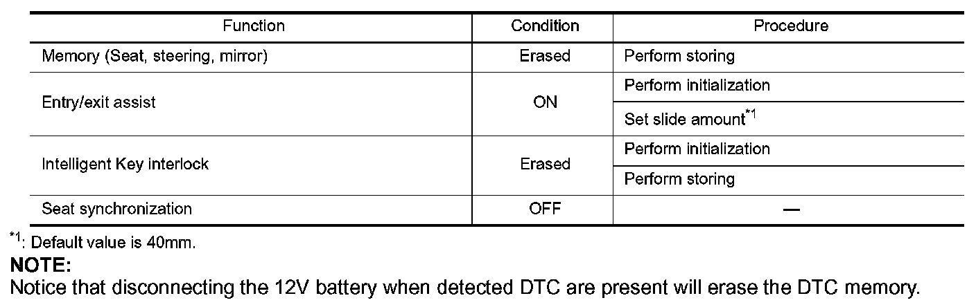 Each function is reset to the following condition when the 12V battery terminal is disconnected.