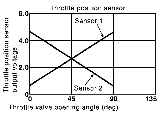 The throttle position sensor has two sensors. These sensors are a kind of potentiometer which transform the throttle valve position into output voltage, and emit the voltage signals to the ECM. The ECM