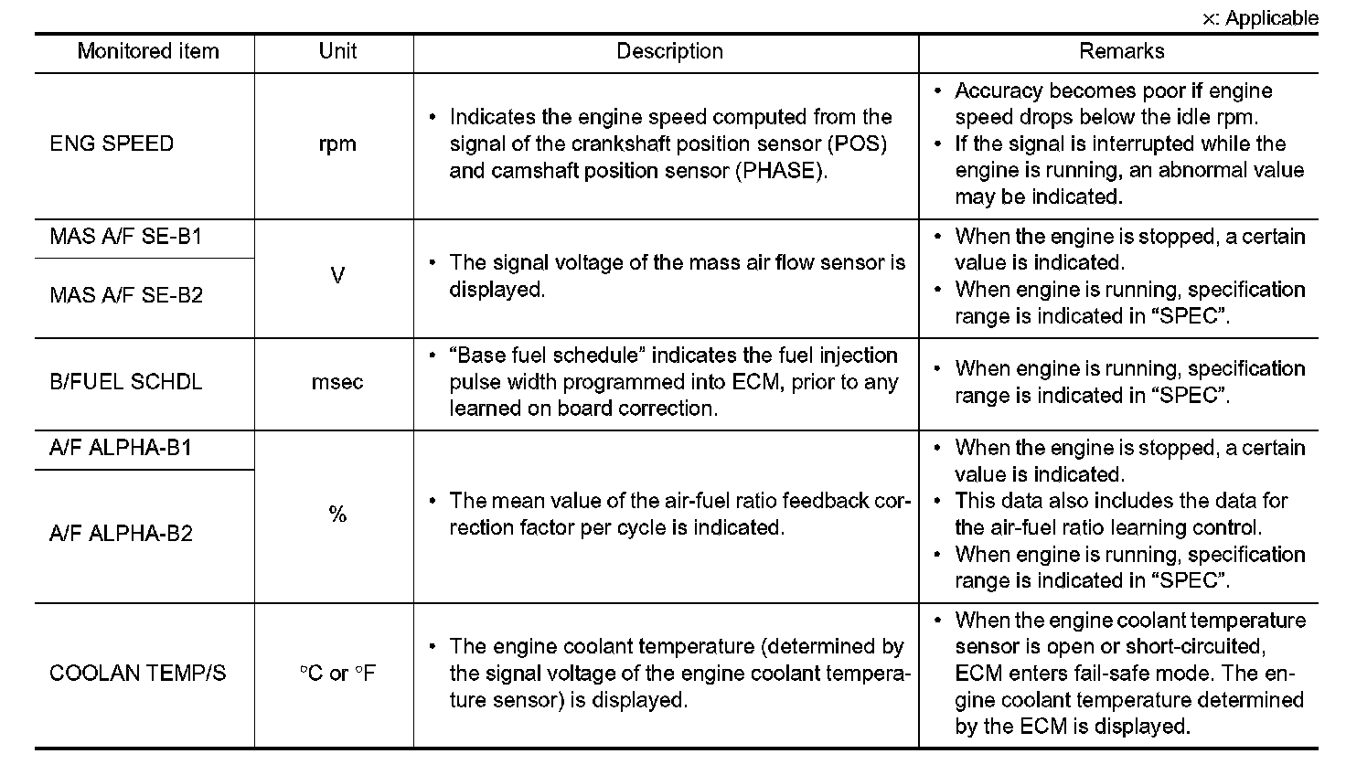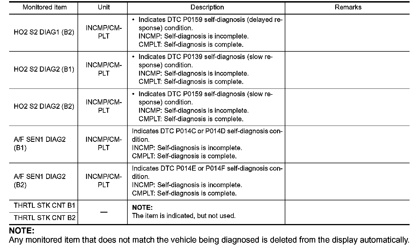 Any monitored item that does not match the vehicle being diagnosed is deleted from the display automatically.