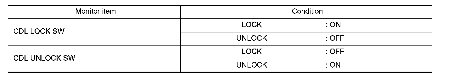 Check ("CDL LOCK SW ", "CDL UNLOCK SW") in "DATA MONITOR" mode for "POWER DOOR LOCK SYSTEM" with CONSULT. Consult Function.