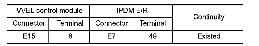 4.Check the continuity between VVEL control module harness connector and IPDM E/R harness connector.