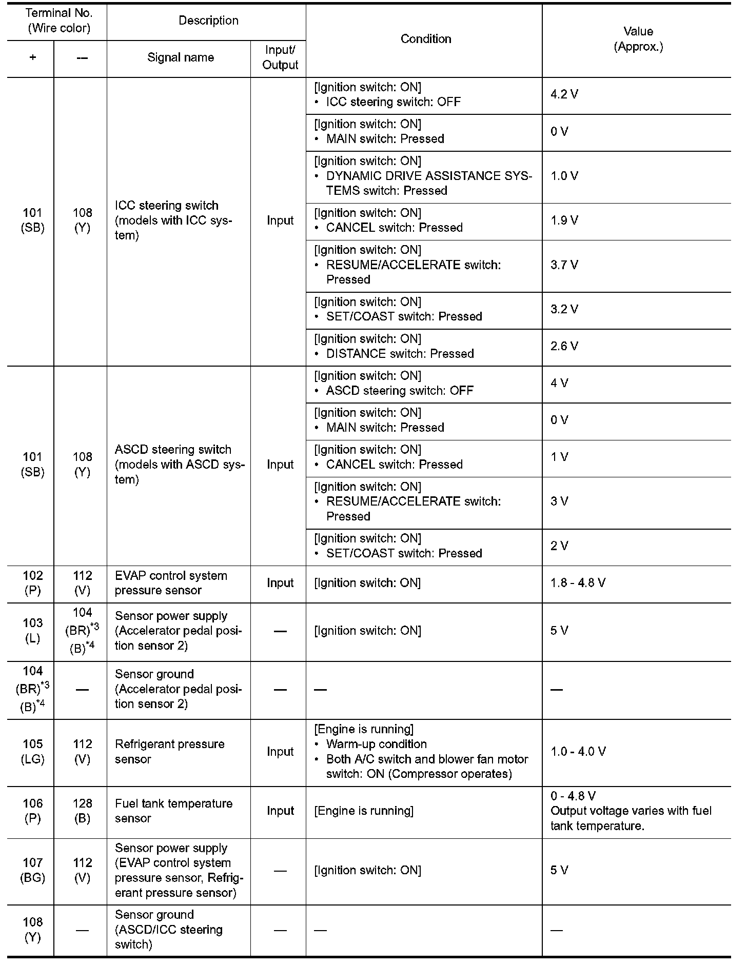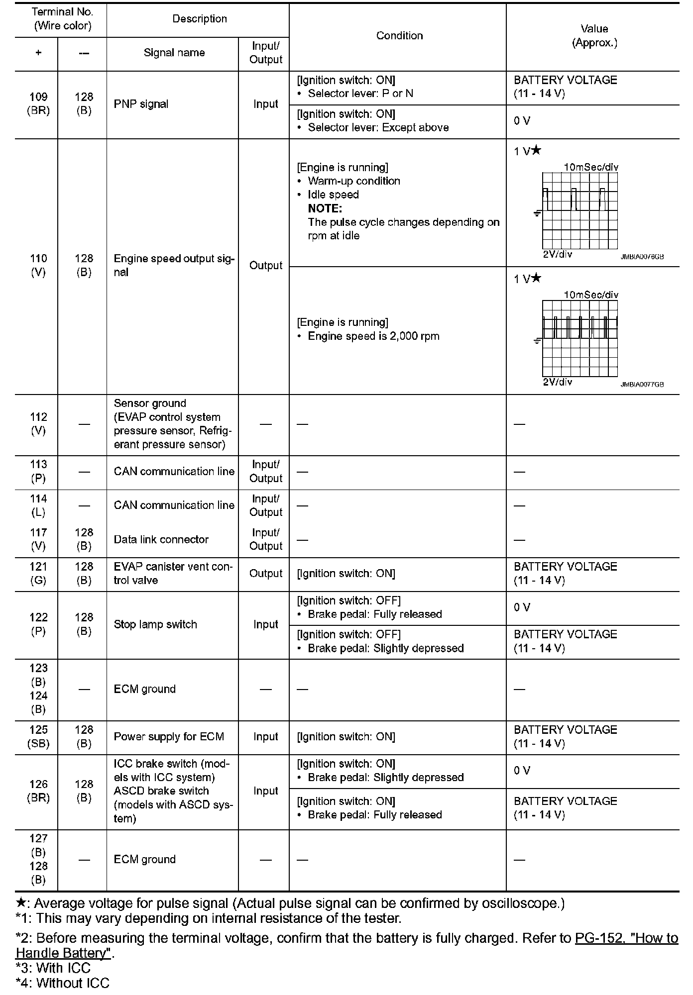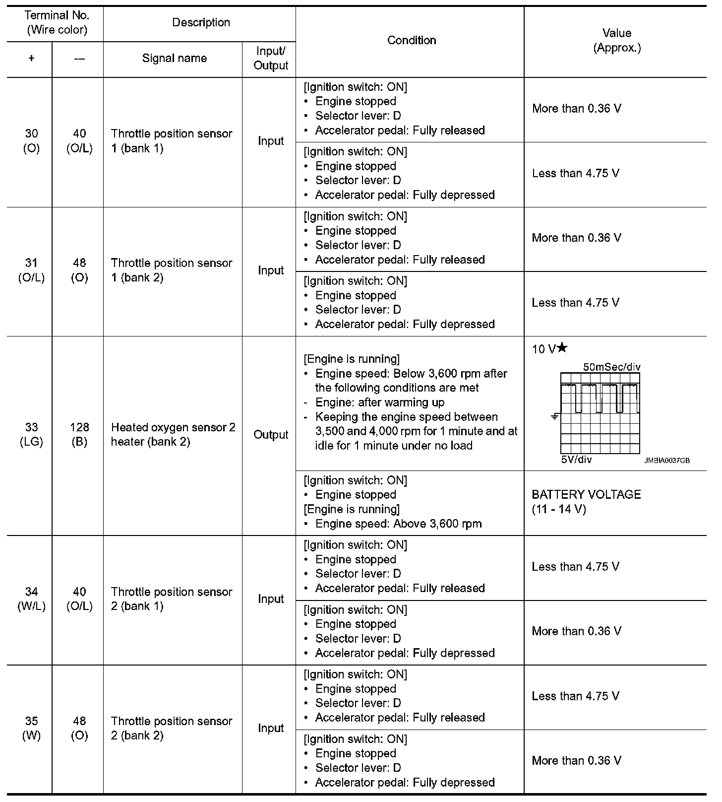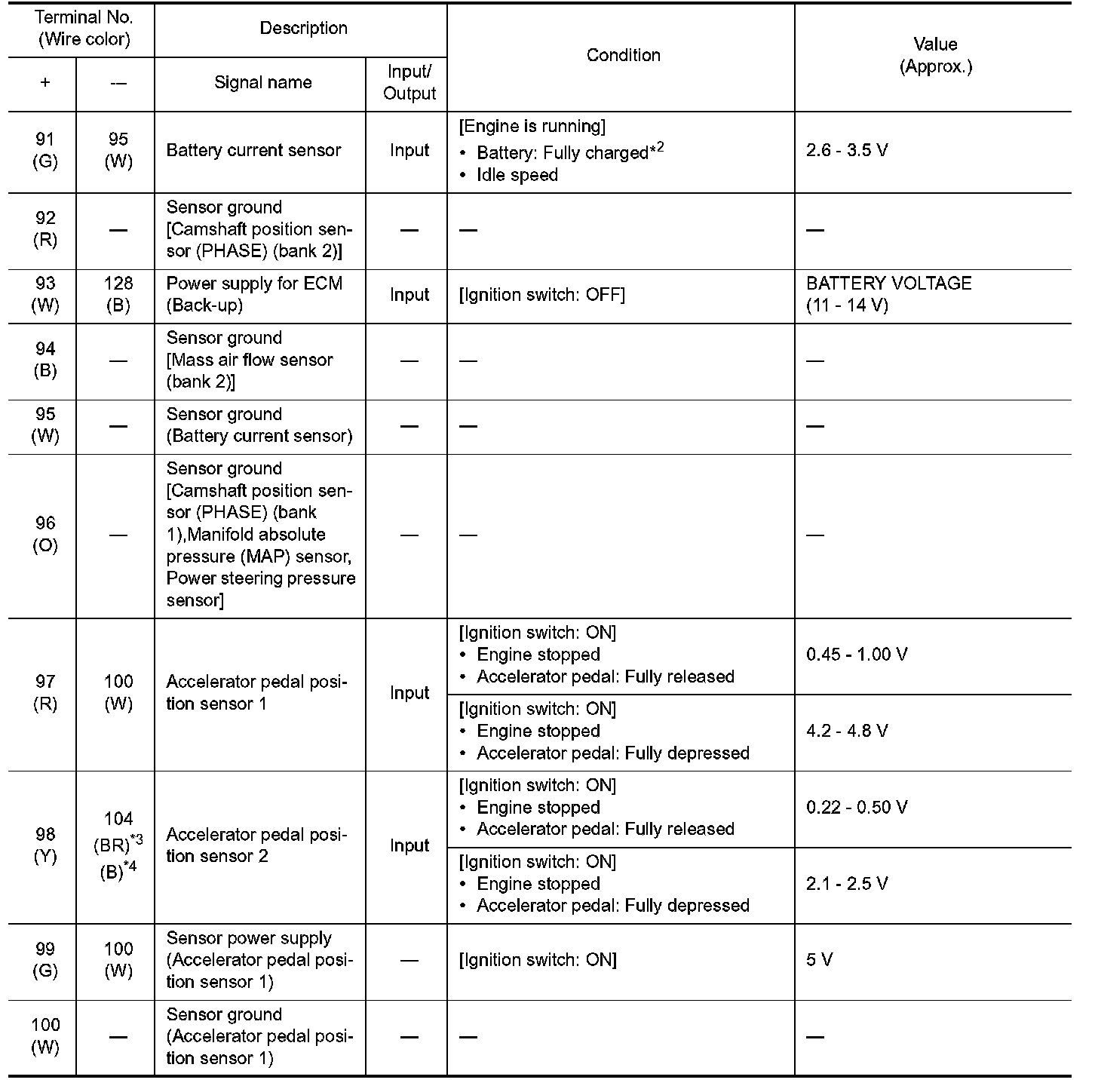 *1: Accelerator pedal position sensor 2 signal and throttle position sensor 2 signal are converted by ECM internally. Thus, they differ from ECM terminals voltage signal.