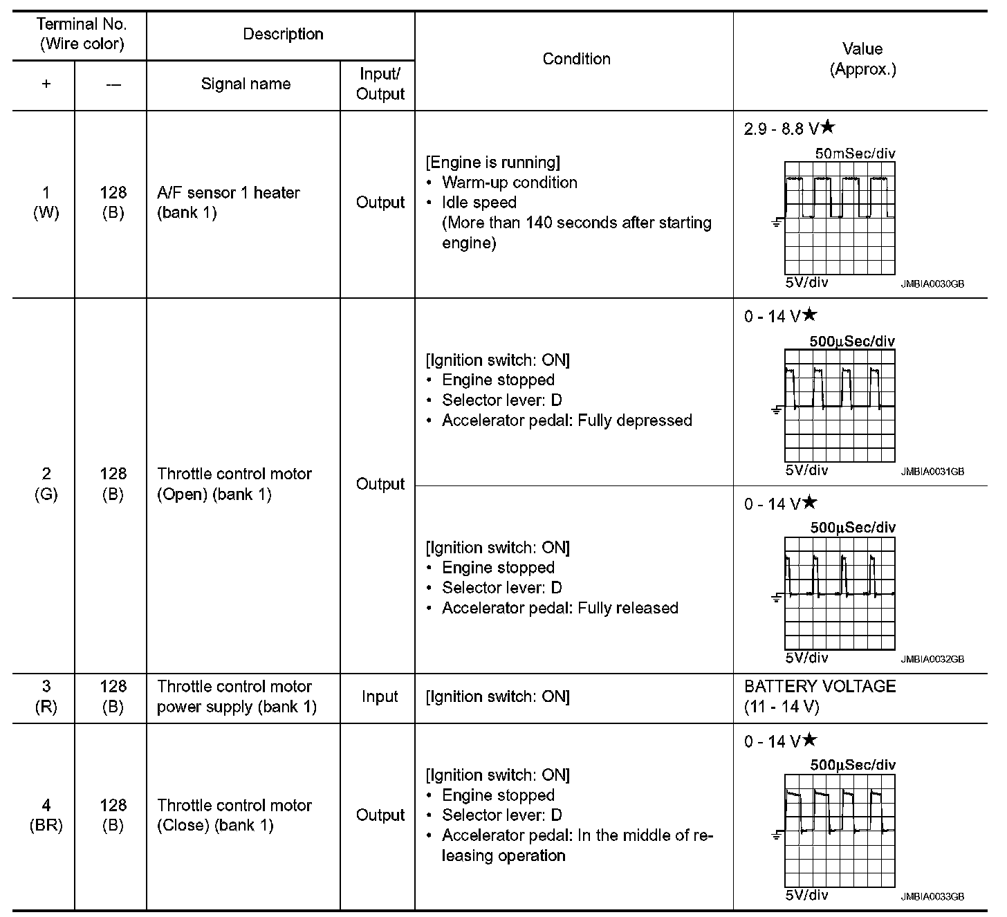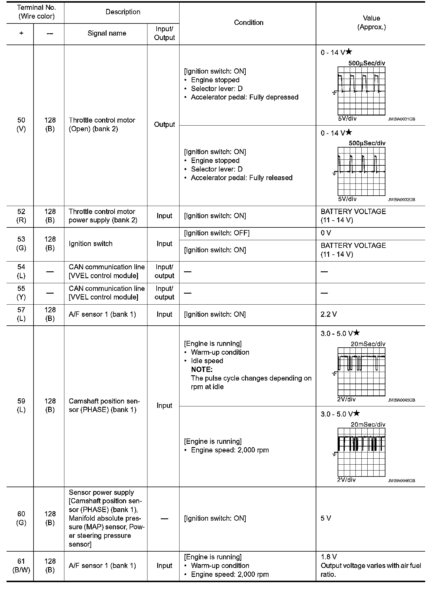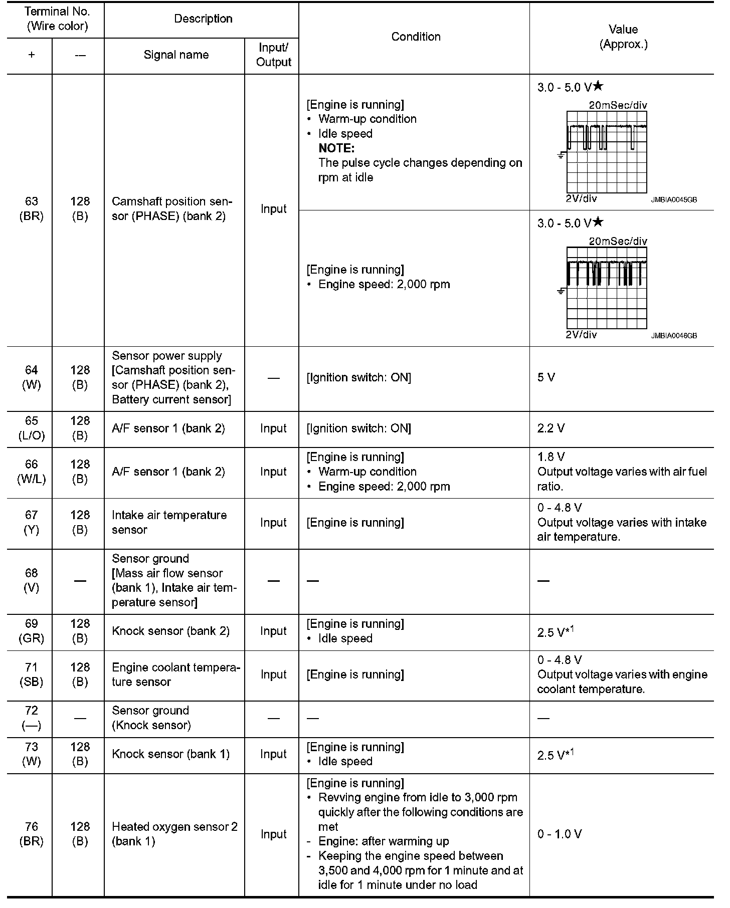 *1: Accelerator pedal position sensor 2 signal and throttle position sensor 2 signal are converted by ECM internally. Thus, they differ from ECM terminals voltage signal.