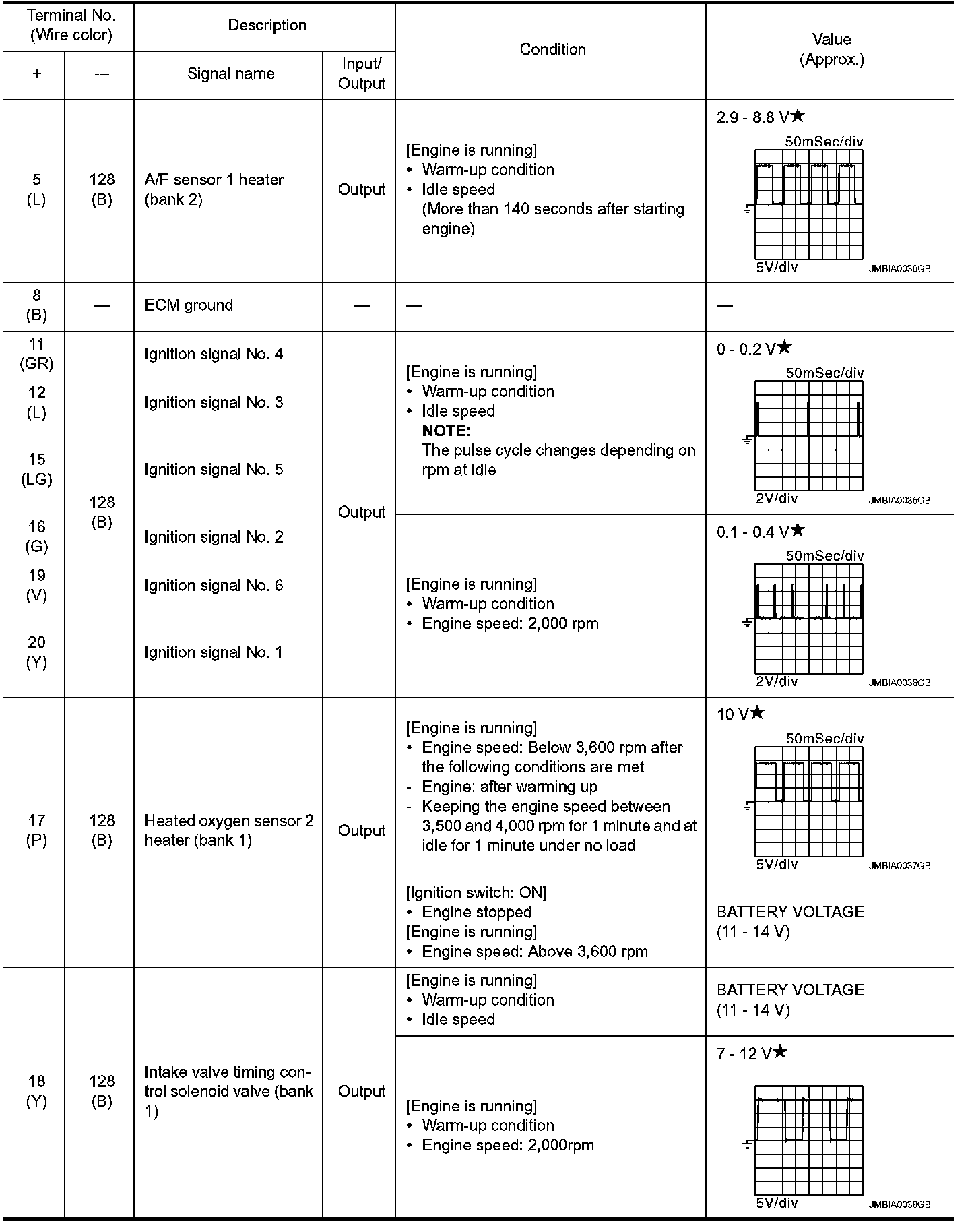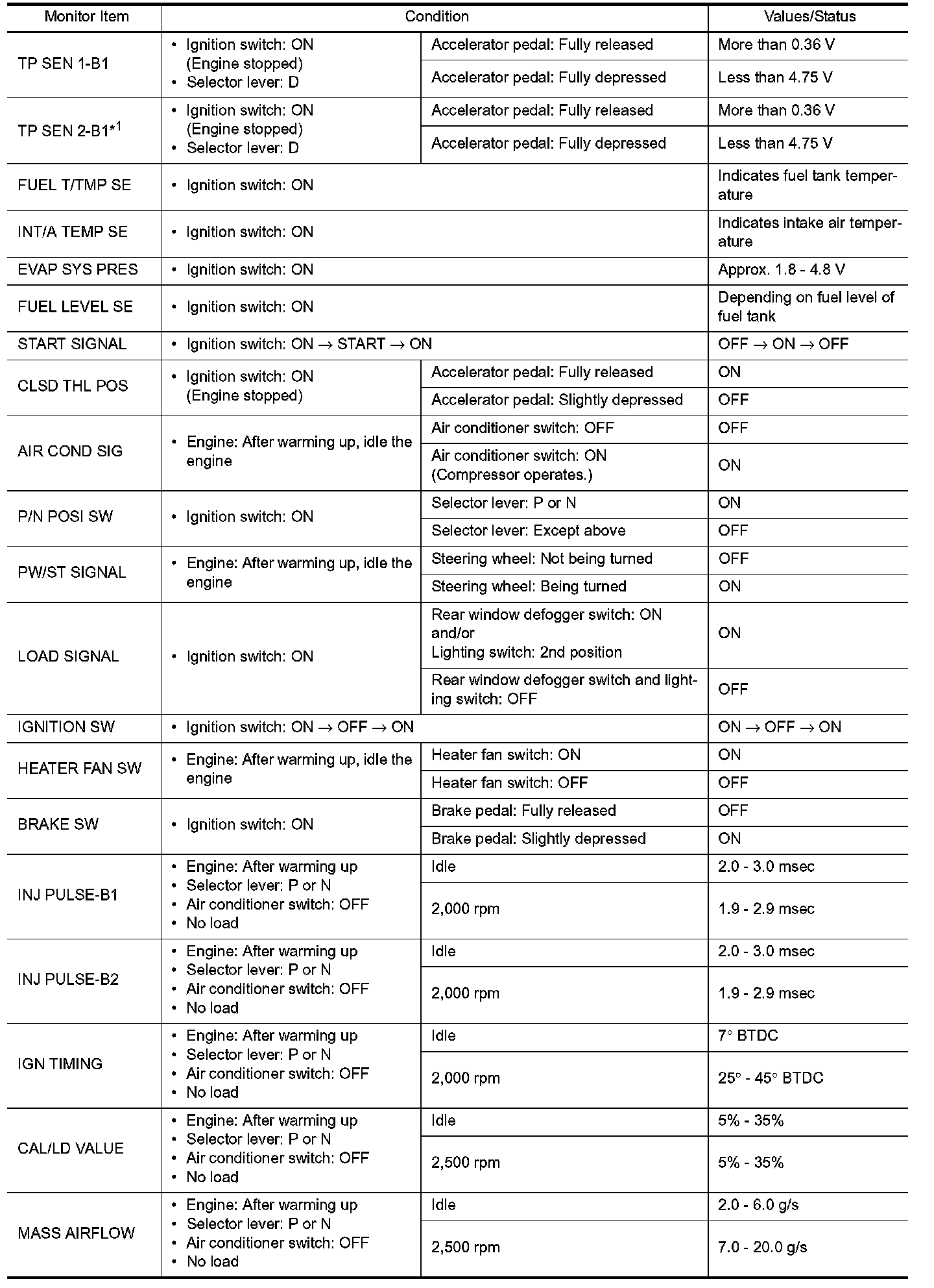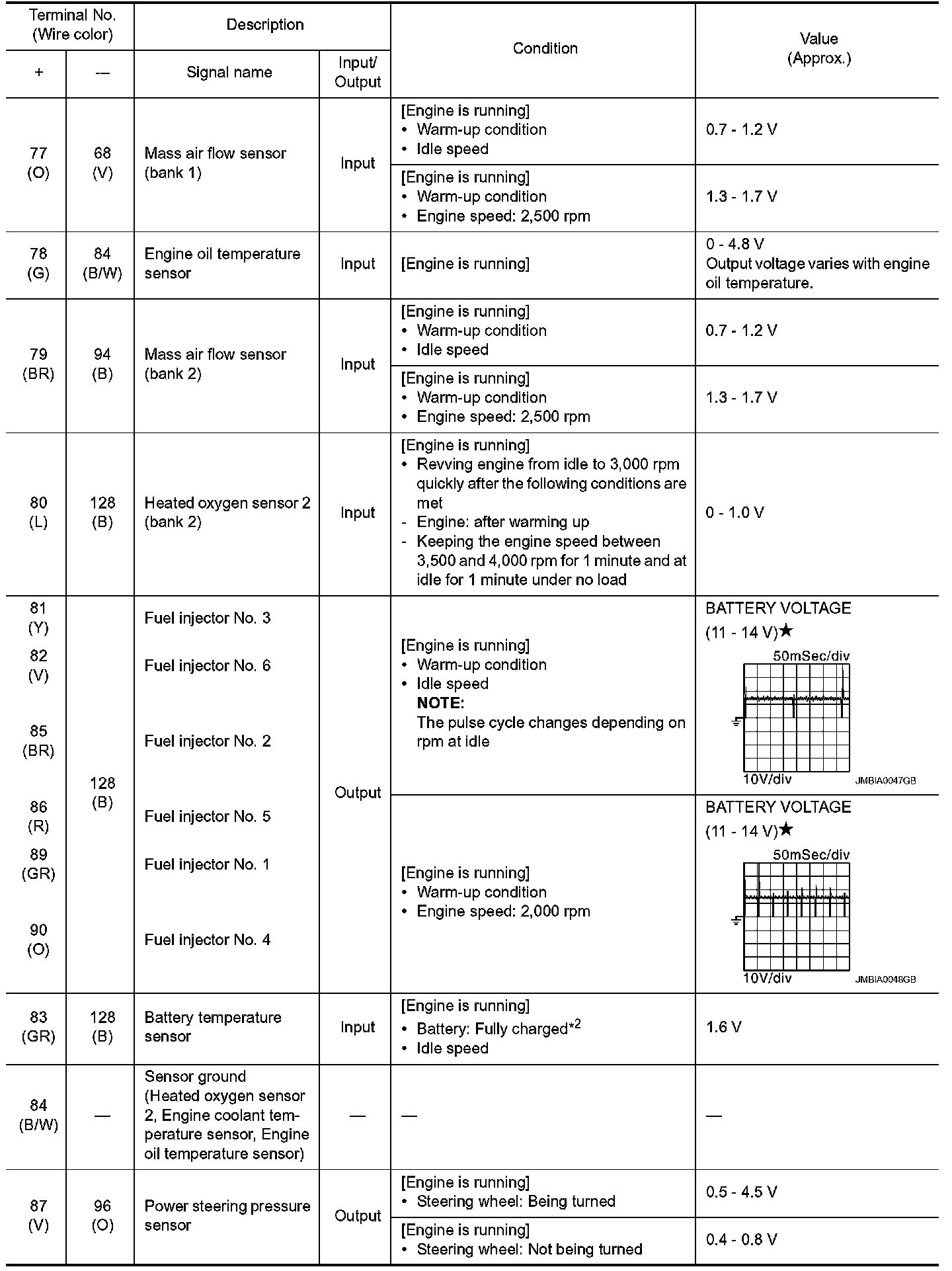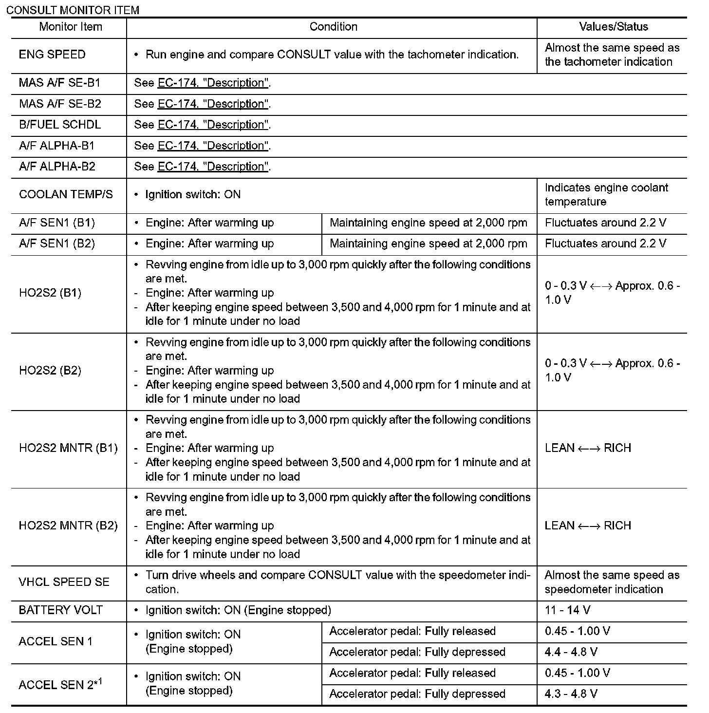 *1: Accelerator pedal position sensor 2 signal and throttle position sensor 2 signal are converted by ECM internally. Thus, they differ from ECM terminals voltage signal.