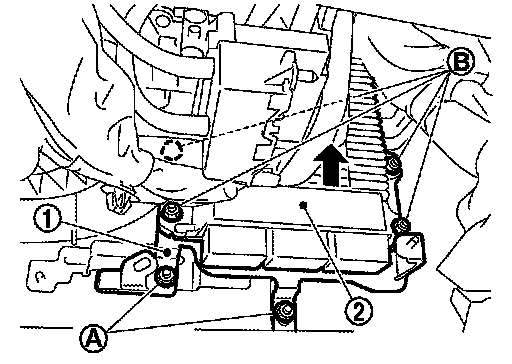 7.Remove ECM bracket bolts (B) and separate ECM (2) and ECM