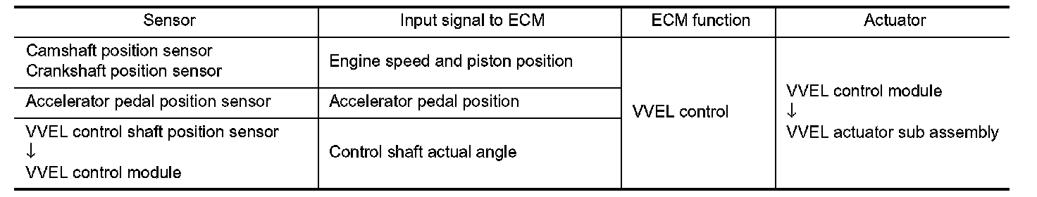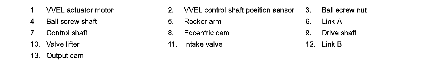 VVEL (Variable Valve Event & Lift) is a system that controls valve event and valve lift continuously. Rotational movement of the drive shaft equipped with eccentric cam is transmitted to output cam via the rocker arm and two kinds of links to depress the intake valve. ECM decides the target valve lift according to the driving condition and sends the command signal to the VVEL control module. The VVEL control module controls the rotation of the control shaft using the VVEL actuator motor and changes the movement of the output cam by shifting the link supporting point. As a result, valve lift changes continuously to improve engine output and response.