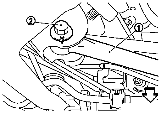 - If camber is exceeds the standard value, adjust with adjusting bolt (2) in rear lower link (1).
