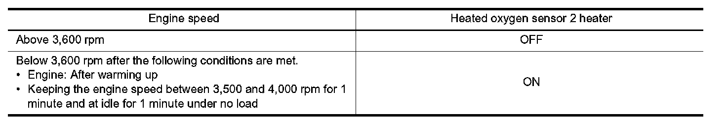 The ECM performs ON/OFF control of the heated oxygen sensor 2 heater corresponding to the engine speed, amount of intake air and engine coolant temperature.