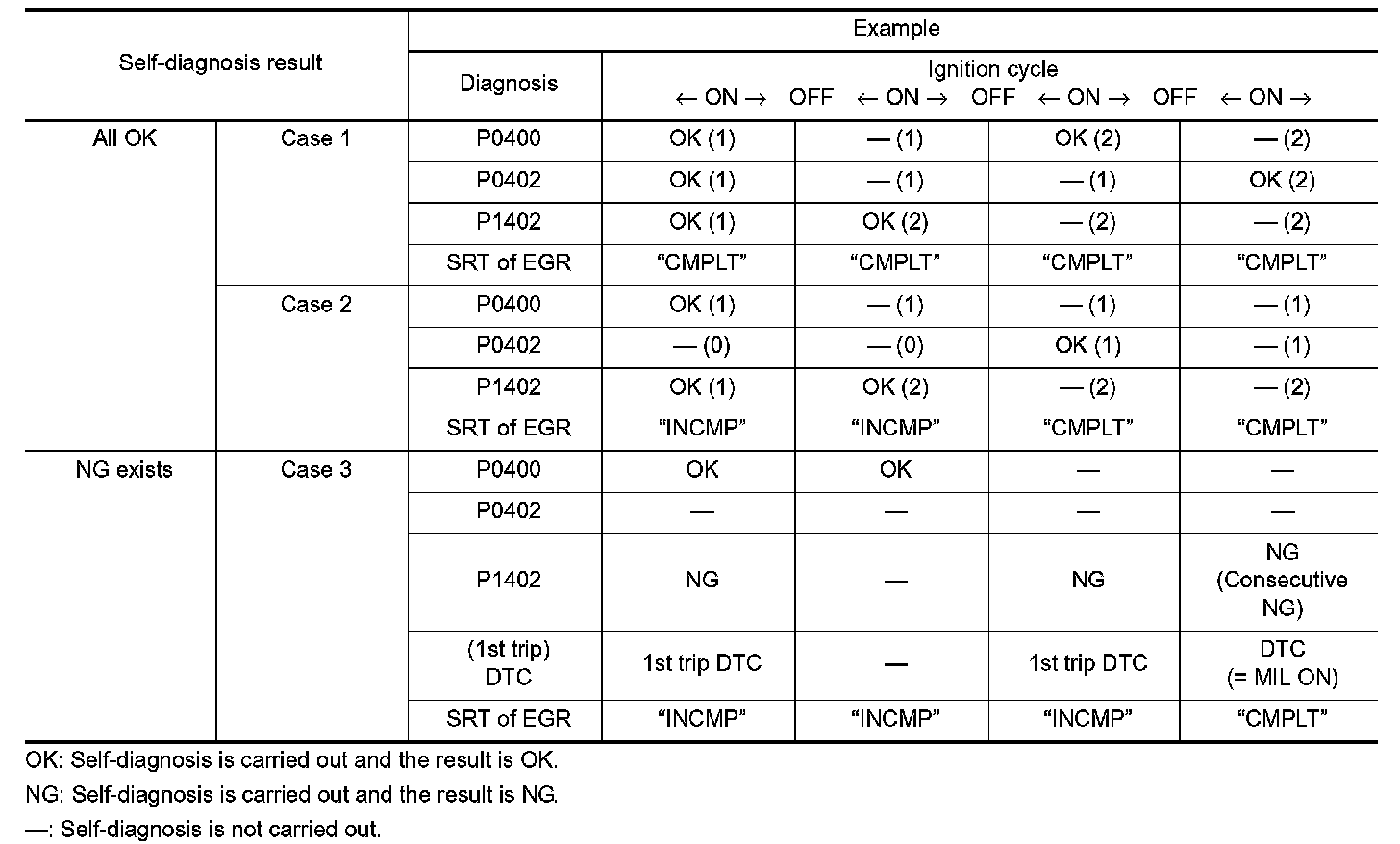 When all SRT related self-diagnoses show OK results in a single cycle (Ignition OFF-ON-OFF), the SRT will indicate "CMPLT".-> Case 1 above