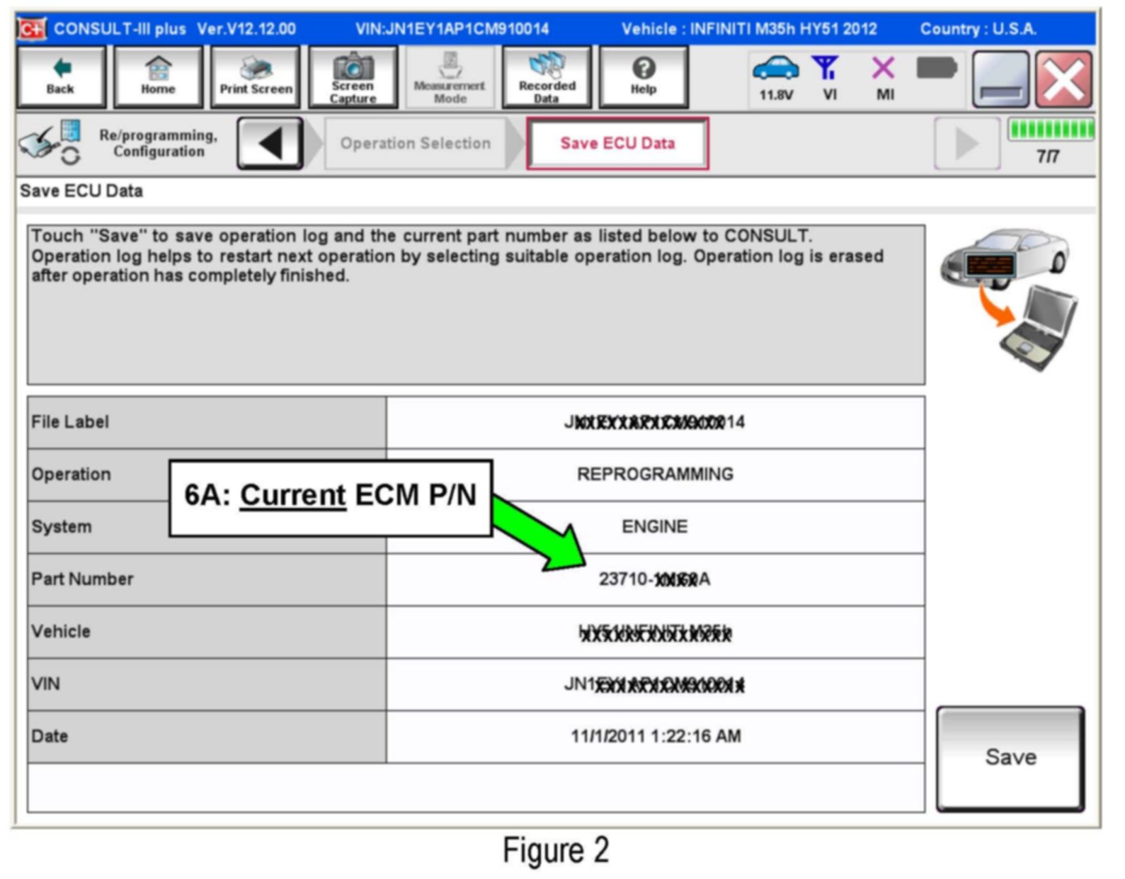 1. Connect the CONSULT PC to the vehicle to begin the reprogramming procedure.
