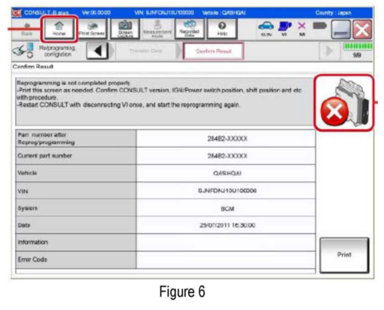 If reprogramming does not complete and the "X" icon displays as shown in Figure 6: