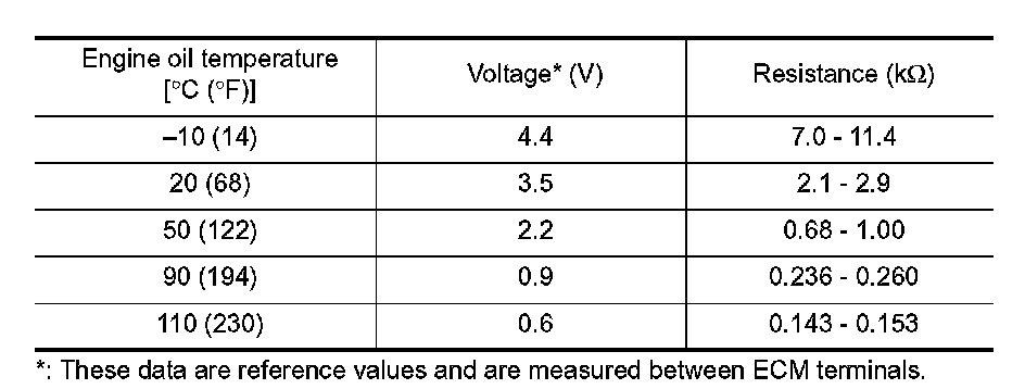 The engine oil temperature sensor is used to detect the engine oil temperature. The sensor modifies a voltage signal from the ECM.