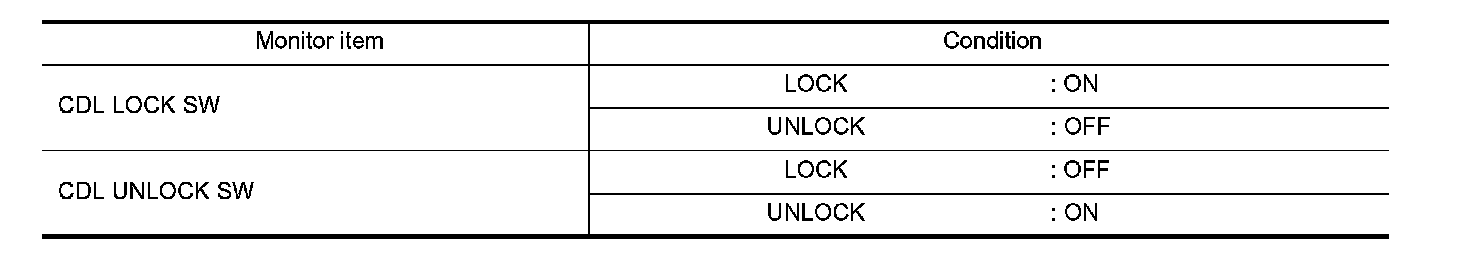 Check ("CDL LOCK SW ", "CDL UNLOCK SW") in "DATA MONITOR" mode for "POWER DOOR LOCK SYSTEM" with CONSULT. CONSULT Function.