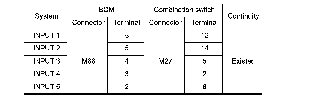 3.Check continuity between BCM harness connector and combination switch harness connector.